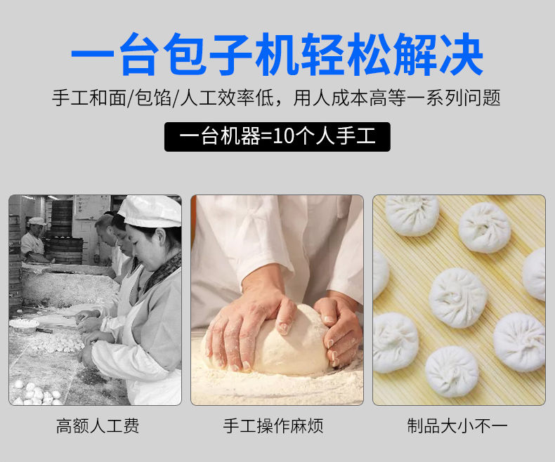 XZ-290A智能型卷面包子機,仿手工智能包子機。操作簡單、精準控制、快速成型、模擬人工。好機器,表里如一,專注品質機器,客戶現場試機。一臺包子機輕松解決手工和面/包餡/人工效率低,用人成本高等一系列問題。