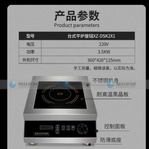 臺式平爐旋鈕XZ-DSK2X1,商用智能電磁爐3500W大火力、節能省電、聚能加熱。您需要一臺經久耐用的好電磁爐不銹鋼材質加厚不銹鋼架構,穩定耐用,不易生銹,耐腐蝕,易清潔,干凈省事。