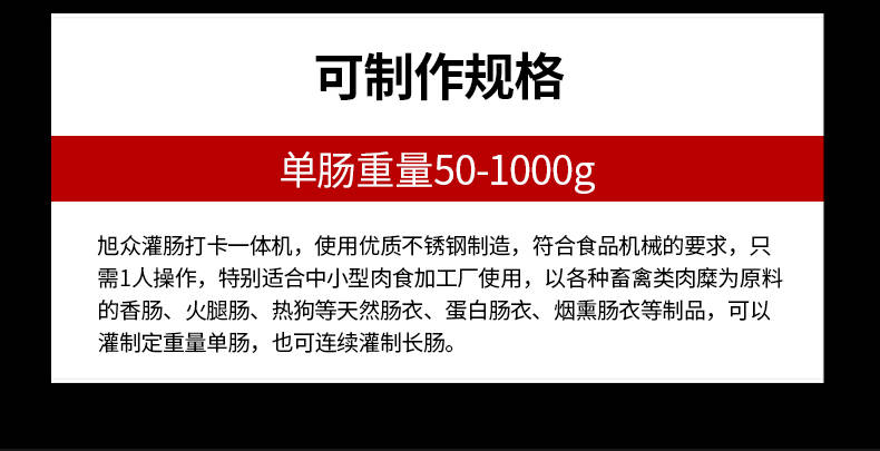 XZ-I型自動定量灌腸機,使用優質不銹鋼制造,符合食品機械的要求,只需1人操作,特別適合中小型肉食加工廠使用,以各種畜禽類肉糜為原料的香腸、火腿腸、熱狗等天然腸衣、蛋白腸衣、煙熏腸衣等制品,可以灌制定重量單腸,也可連續灌制長腸。