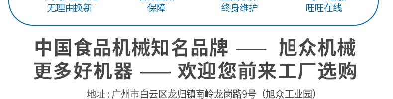 廣州旭眾食品機(jī)械有限公司是一家集科研開發(fā),生產(chǎn)設(shè)計(jì),營(yíng)銷服務(wù)為一體的現(xiàn)代化生產(chǎn)企業(yè)。現(xiàn)代化生產(chǎn)車間,精湛制造技術(shù),所產(chǎn)機(jī)械歷經(jīng)市場(chǎng)重重考驗(yàn),不斷贏得海內(nèi)外客戶的贊譽(yù)。
