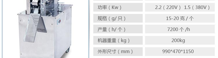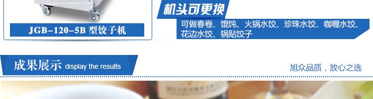 JGB-120-5B型餃子機,本機是一款可生產各種肉餡、肉菜混合餡、全菜餡及其他種餡餃子的設備。一機多用途,只要更換模具,就可制作不同的食品,如春卷、餛飩、咖喱角、鍋貼等。適用于賓館、飯店、餐廳、團體食堂加工,幼兒園、速凍餃子生產。