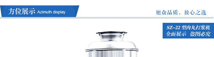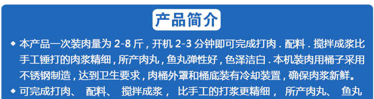 SZ-22型肉丸打漿機,本機裝肉用桶子采用不銹鋼制造,達到衛生要求,肉桶外罩和桶底裝有冷卻裝置,確保肉漿新鮮。比手工的打漿更精細,所產肉丸、魚丸彈性好,色澤潔白。